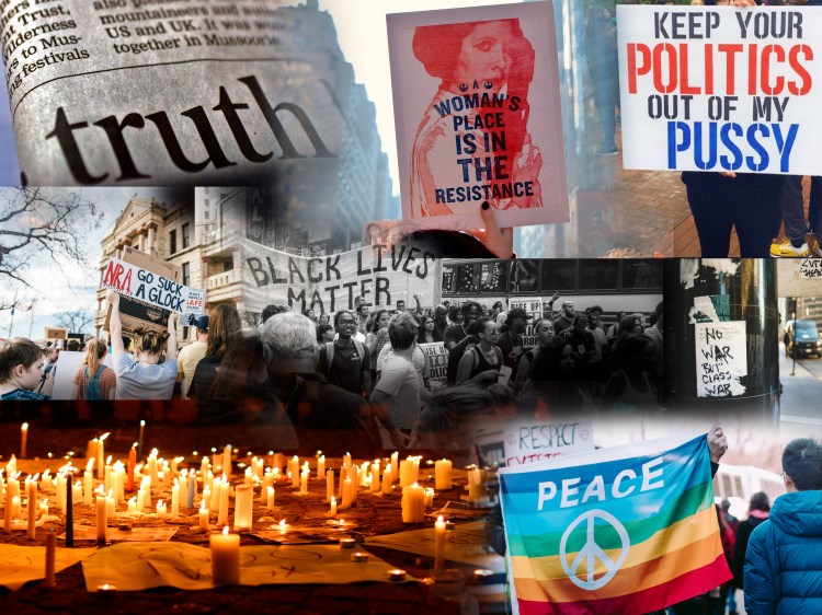 The first image I added to the collage was protest poster board picture of Carrie Fisher as Pincess Leia with the words “A women’s place is in the resistance.” Once I added that, it was like someone had pushed a boulder down a hill, I was on a roll.